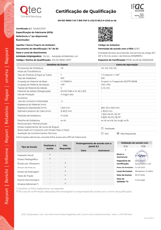 Em vários trabalhos que a H2TEC executa existe a obrigatoriedade de os soldadores serem certificados, no entanto, a principal razão para a certificação é a comprovação da qualidade do trabalho e competências.