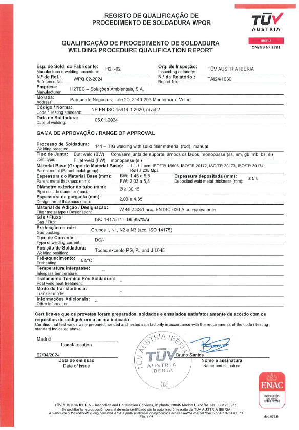 A área de atuação da H2TEC pressupõe a soldadura em aço inoxidável e em aço carbono, portanto, além da certificação dos nossos procedimentos de soldadura, também certificamos os nossos soldadores.